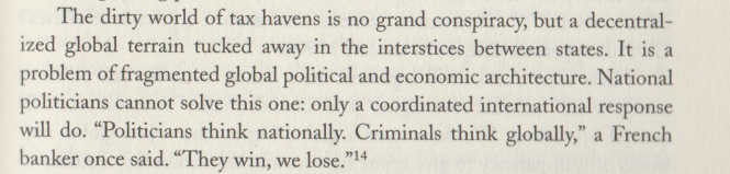 They are all a pretty shrewd, wise, and canny bunch of crimbos here really on this laundry island and I will tell you why. Treasure Islands by Shaxson quotes 1 in a 1000 conviction rates for cross border laundry cases